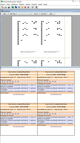 O SPLOTO Profissional é um software para elaboração de jogos e impressão de volantes para as loterias Megasena, Quina, Dupla Sena e Lotomania.